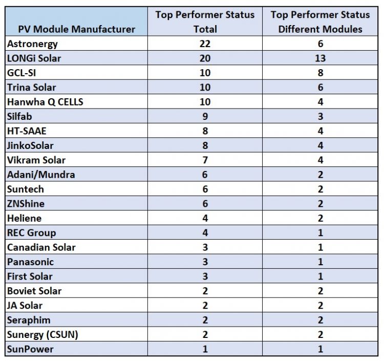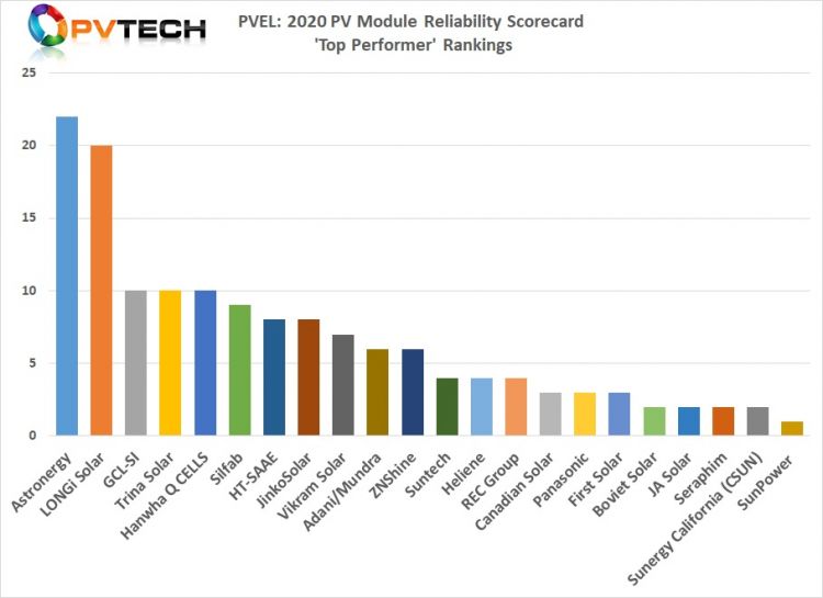 Astronergy zdominował kartę wyników niezawodności modułów fotowoltaicznych PV Evolution Labs w 2020 r., zdobywając łącznie 22 punkty (za najlepsze wyniki i wyróżniając je pod względem kilku innych podstawowych wskaźników).